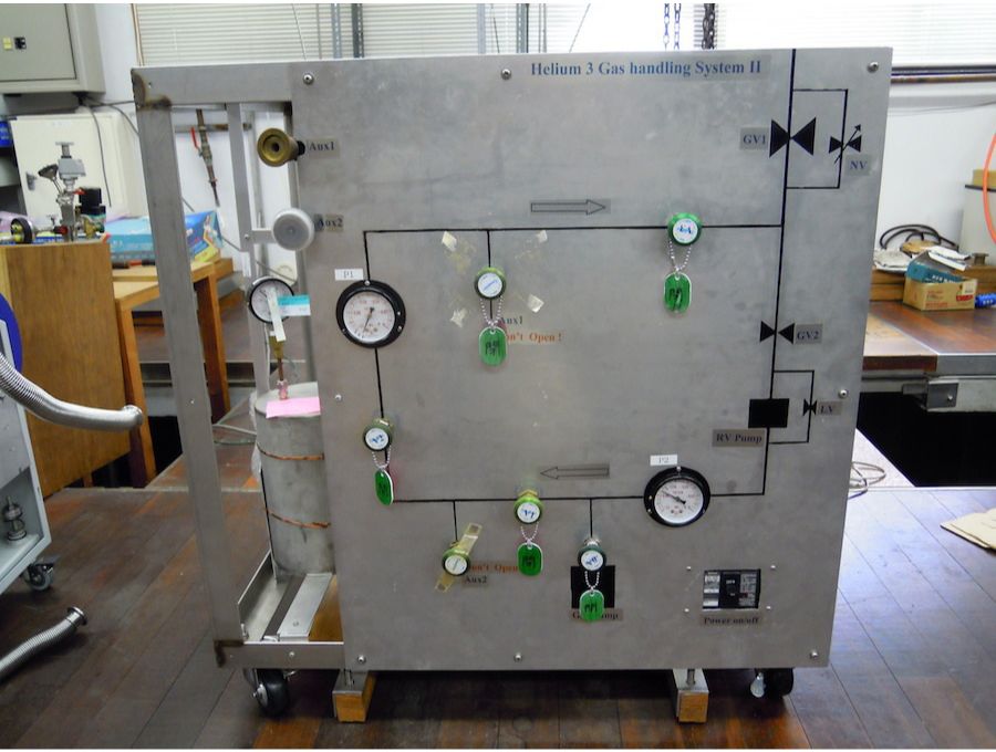 当研究室の主力装置。5月〜8月、10月〜12月、1月〜3月の期間、稼働を続ける。3Heシステムを使えば最低温度0.45 Kまで冷却可能。