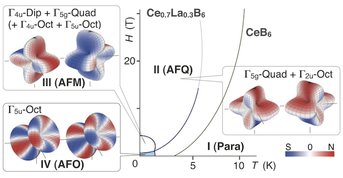 CexLa1-xB6の磁気相図.反強磁性秩序のほか,電気四極子秩序,磁気八極子秩序など,特殊な秩序状態が実現する.