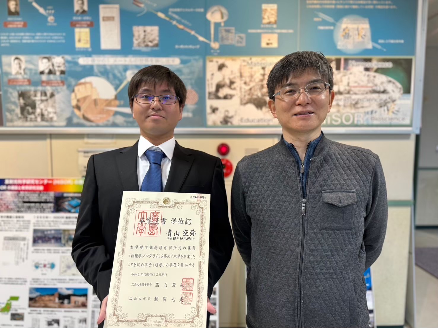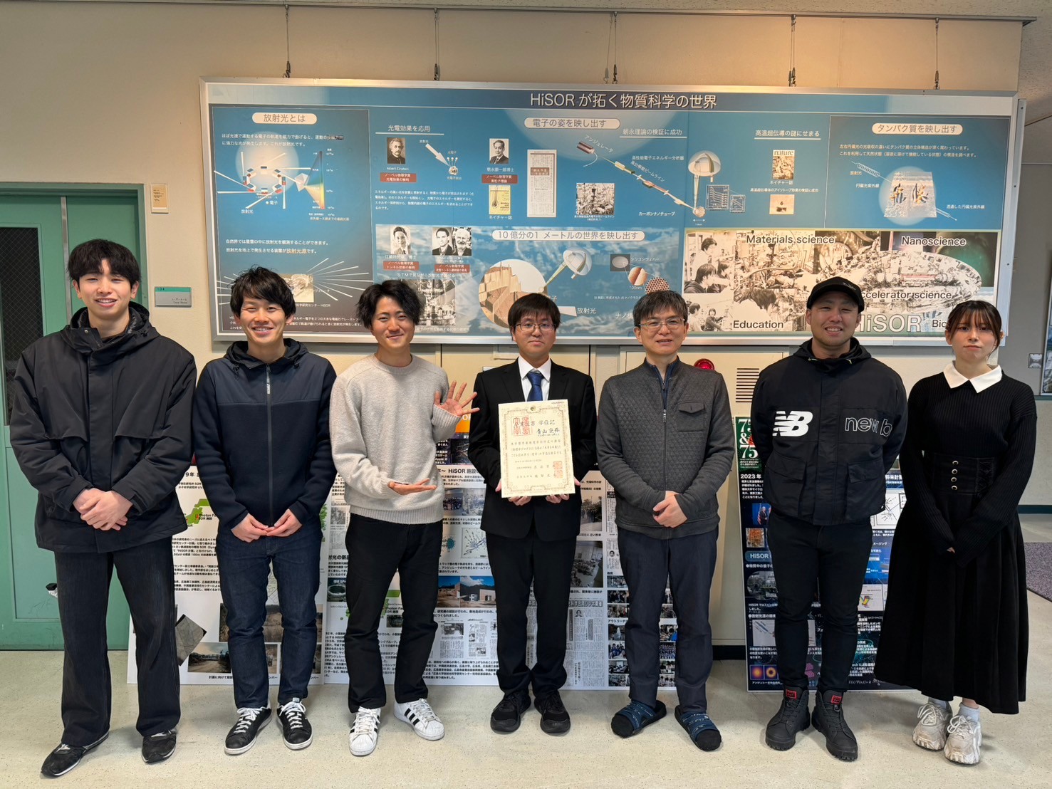 物理学科卒業式が行われました。 2024.3.23に広島大学理学部物理学科卒業式が行われました。 B4青山さんが学士を得て卒業されました。おめでとうございます。 B4青山さん 松尾 准教授 研究グループメンバー 来年度も同メンバーでの活動となります。引き続きよろしくお願いいたします。 ※Mohamed 助教が出張のため不在でした。