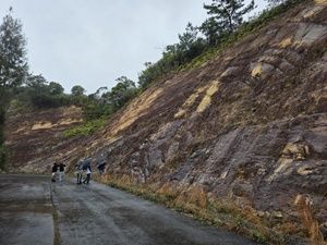 | 最終日は四万十帯に対比される嘉陽層の褶曲と,海水通気帯で形成されるビーチロックを観察して,今年の巡検は終了. | |