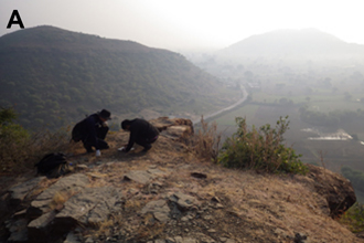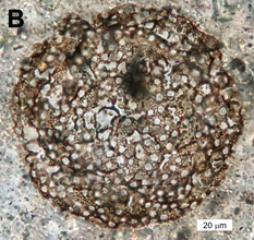 図.(A)野外調査をするPandeyさんたち,(B)発見された初期の真核生物化石.