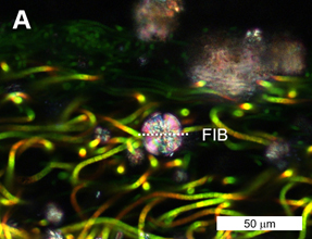 Figure: (A) Spherulites examined, (B) STXM analysis results of FIB-processed thin foil.