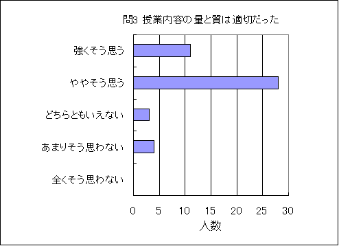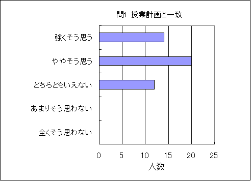 問1. 講義内容・シラバスと授業の内容は一致していた (この授業の平均値 4.0) (他の授業も含めた全体での平均値 数3.8,物3.7,化3.7,生3.9,地3.5,理3.7) |
