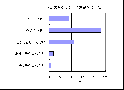 問2. 授業の内容は興味がもて学習意欲がわいた (この授業の平均値 3.8) (数3.6,物3.4,化3.5,生3.8,地3.4,理3.5) |