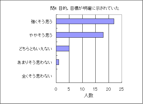 問4. 授業の目的,目標が明確に示されていた (この授業の平均値 4.3) (数3.7,物3.5,化3.6,生3.8,地3.3,理3.6) |