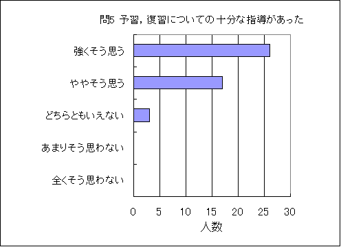 問5. 予習,復習についての十分な指導があった (この授業の平均値 4.5) (数3.1,物3.1,化3.0,生2.9,地2.7,理3.0) |