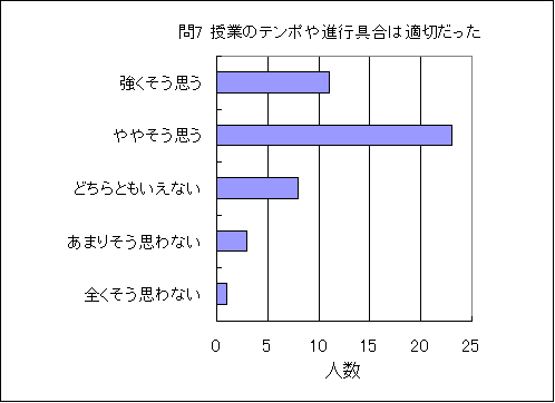 問7. 授業のテンポや進行具合は適切であった (この授業の平均値 3.9) (数3.5,物3.5,化3.4,生3.5,地3.3,理3.4) |