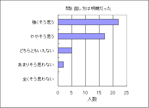 問8. 教官の話し方は明瞭で聞き取りやすかった (この授業の平均値 4.3) (数3.5,物3.5,化3.5,生3.6,地3.4,理3.5) |