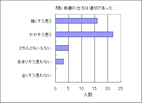 問9. 板書の仕方は適切であった (この授業の平均値 4.1) (数3.5,物3.2,化3.4,生3.3,地3.2,理3.3) |