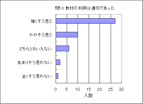 問10. 教材(テキスト,プリント,OHP,ビデオ等)の利用は適切であった (この授業の平均値 4.3) (数3.5,物3.4,化3.4,生3.6,地3.5,理3.4) |