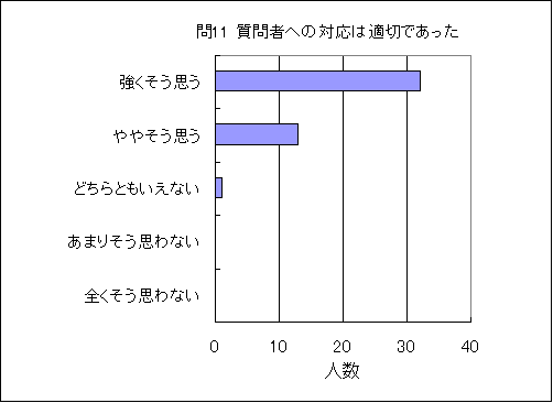 問11.質問者への対応は適切であった (この授業の平均値 4.7) (数3.7,物3.7,化3.6,生4.0,地3.5,理3.7) |