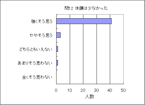 問12. 休講は少なかった (この授業の平均値 4.8) (数4.3,物3.7,化3.7,生3.9,地3.5,理3.8) |