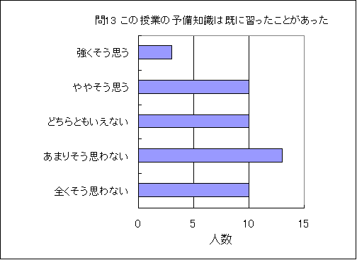 問13. この授業内容の予備知識は既に高等学校や大学で受講した授業で学んでいた (この授業の受講生の平均値 2.6) (数2.7,物2.6,化2.7,生2.8,地2.5,理2.6) |