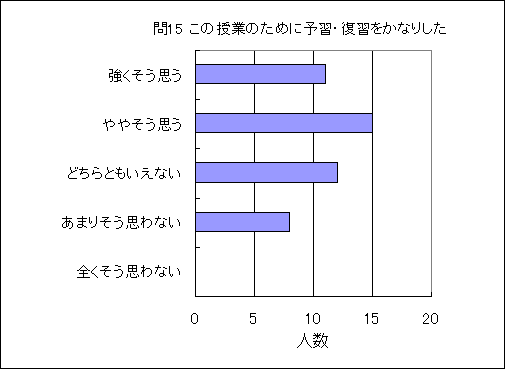 問15. この授業のために予習・復習をかなりした (この授業の受講生の平均値 3.6) (数2.9,物2.6,化2.7,生2.6,地2.3,理2.7) |