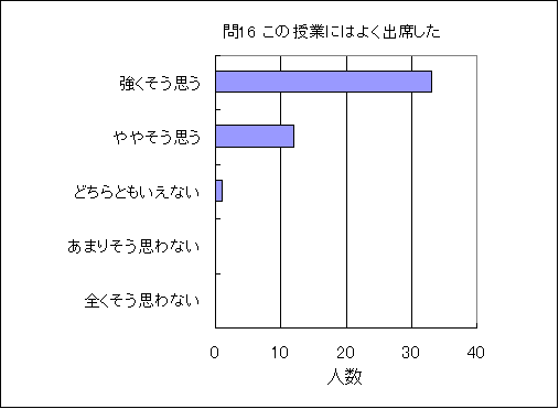 問16. この授業にはよく出席した (この授業の受講生の平均値 4.7) (数4.4,物4.2,化4.4,生4.5,地4.3,理4.3) |