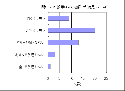 問17. この授業はよく理解でき満足している (この授業の受講生の平均値 3.7) (数3.0,物2.9,化3.2,生3.5,地2.9,理3.1) |