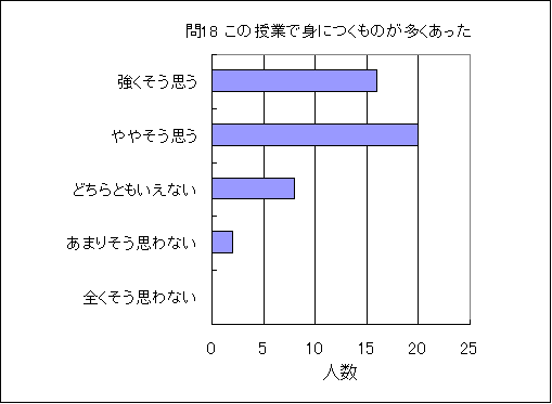 問18. この授業で身につくものが多くあった (この授業の受講生の平均値 4.1) (数3.5,物3.4,化3.5,生3.8,地3.3,理3.5) |