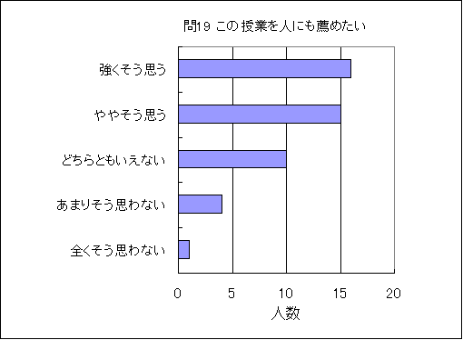 問19. この授業を人にも薦めたい (この授業の受講生の平均値 3.9) (数3.4,物3.3,化3.4,生3.6,地3.2,理3.4) |