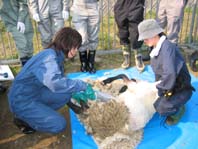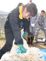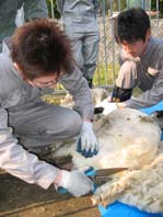 <p><font size="-2">●羊を捕まえ、頭を腹側に押し付けながら、同時にお尻を地面に向かって押すようにすると、羊が自分ですとん、と座ってしまった。羊が苦しくないように、腰と肩の部分に、先生が軽く膝をおいて毛を刈っていく様子を見ていて、羊が非常におとなしくしているので、扱い方を覚えることがとても重要だと感じました。頭で考えるだけでなく、実際の動物に接して経験を積む必要があるということも再認識しました。今後も意欲的にチャレンジしていきたいです。</font></p>