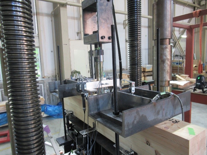集成材の直交方向に2本のラグスクリューボルト(LSB)を埋め込んだ試験体を用いてLSBの引抜き試験を実施しました