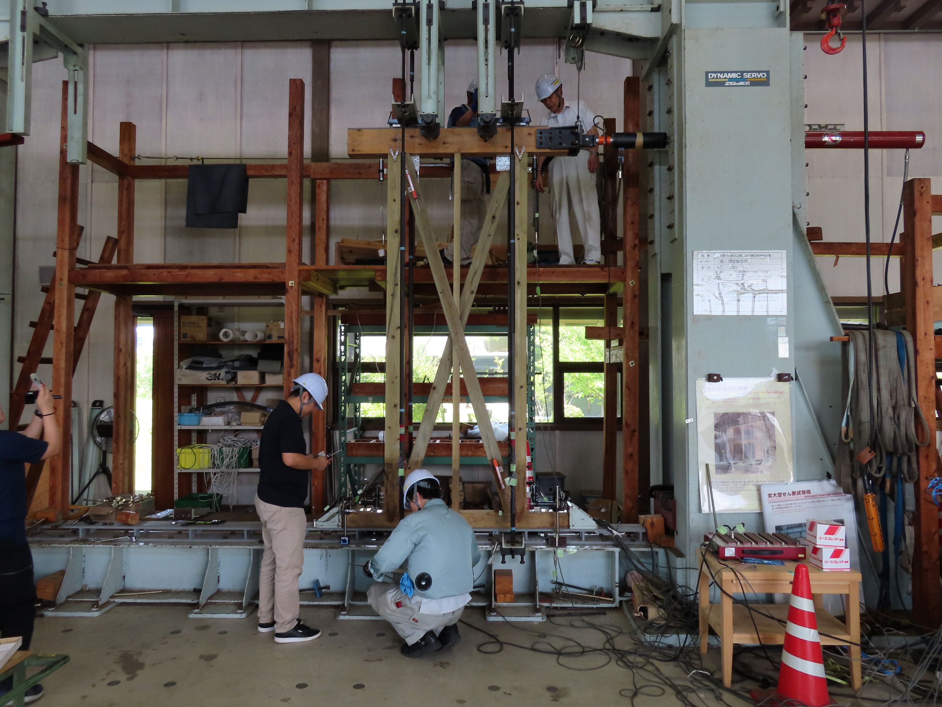 たすき掛け筋かい耐力壁の水平加力試験/Lateral loading test of timber cross-braced shear wall 宮崎県都城市の宮崎県木材利用技術センターにて、たすき掛け筋かい耐力壁の水平加力試験を行いました。 なかなか行うことのできない腐朽した試験体もあり、貴重な経験ができました。 Lateral loading test of timber cross-braced shear wall was conducted in Miyakonojo. (清水/Shimizu)