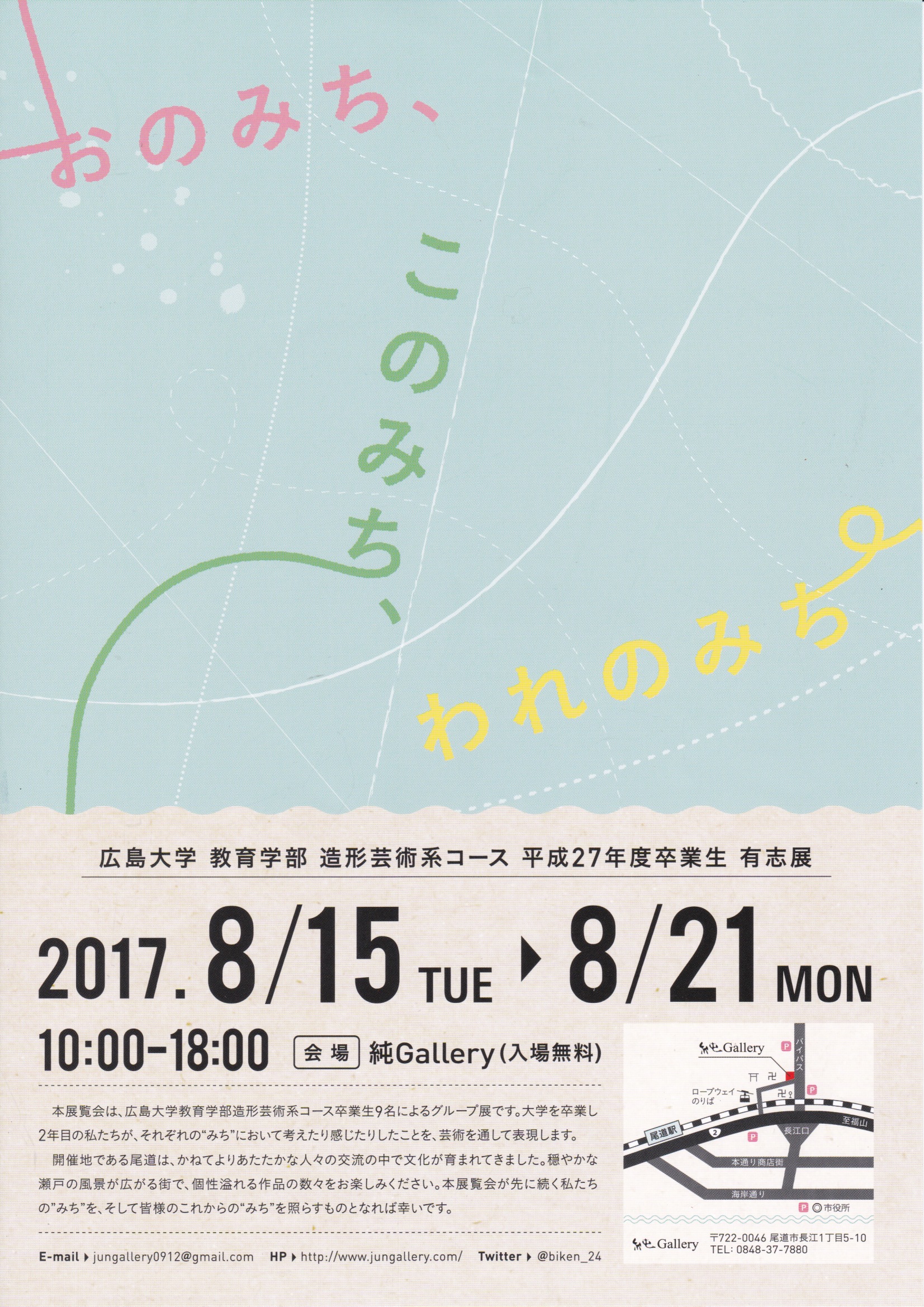 広島大学教育学部造形芸術系コースを平成27年度に卒業した有志の皆さん(24生)が、尾道の純ギャラリーでグループ展を企画しています。卒業して2年目、それぞれが「われのみち」を進み始めています。楽しみな展覧会。(2017/07/25)