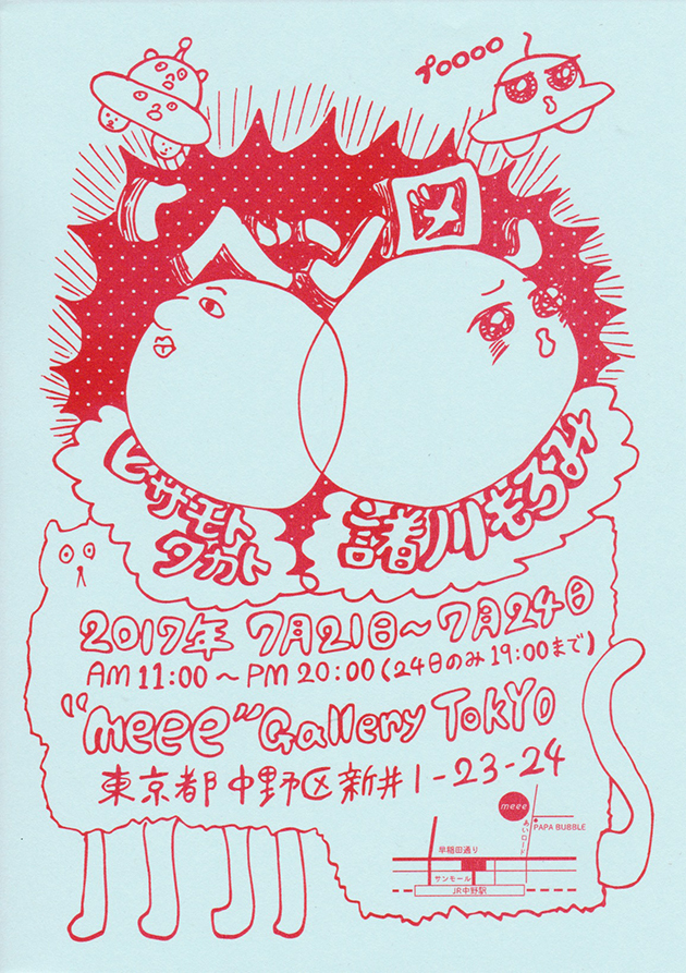去る7月22日(土)、東京・中野のmeee gallery TOKYOで開催されていた本コース卒業生、ヒサモトタカトくんと諸川もろみさん(共に24生)の二人展を訪ねてきました。ヒサモト君の木版画と、諸川さんの日常を切り取ったようなインスタレーションが、楽しい空間を創り出していました。