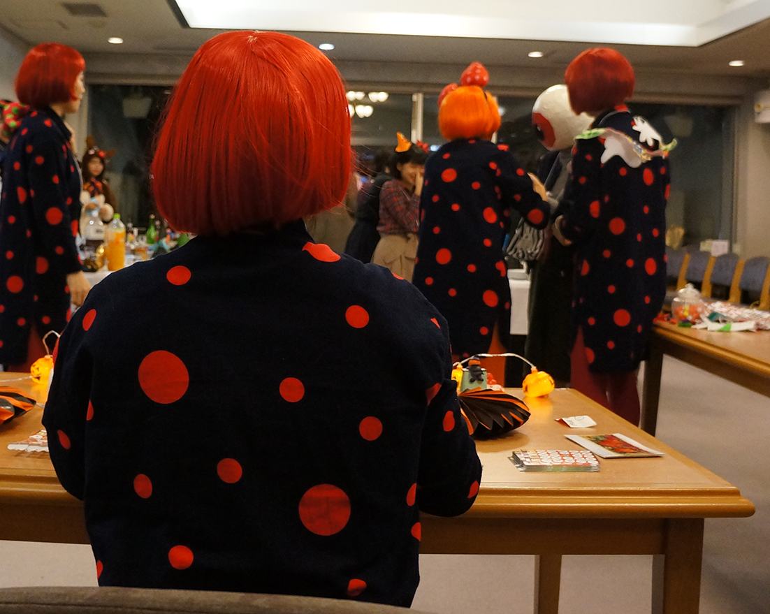 10月19日(木)18:00〜、美研学生主催の「ハロウィン会」が大学構内の北1食堂で開催されました。美術を専門としている学生たちだけあって、衣装に凝ったり、自作の仮装でノリノリ。学生と教職員、あわせて約40名の参加でしたが、ビンゴ大会もあり、研究室に所属する学生達が学年の枠を超えて、交流の輪をより広げる、大変楽しい会となりました。企画してくれた院生の皆さんに感謝です!(写真協力:藤本都里さん、M2の皆さん)
