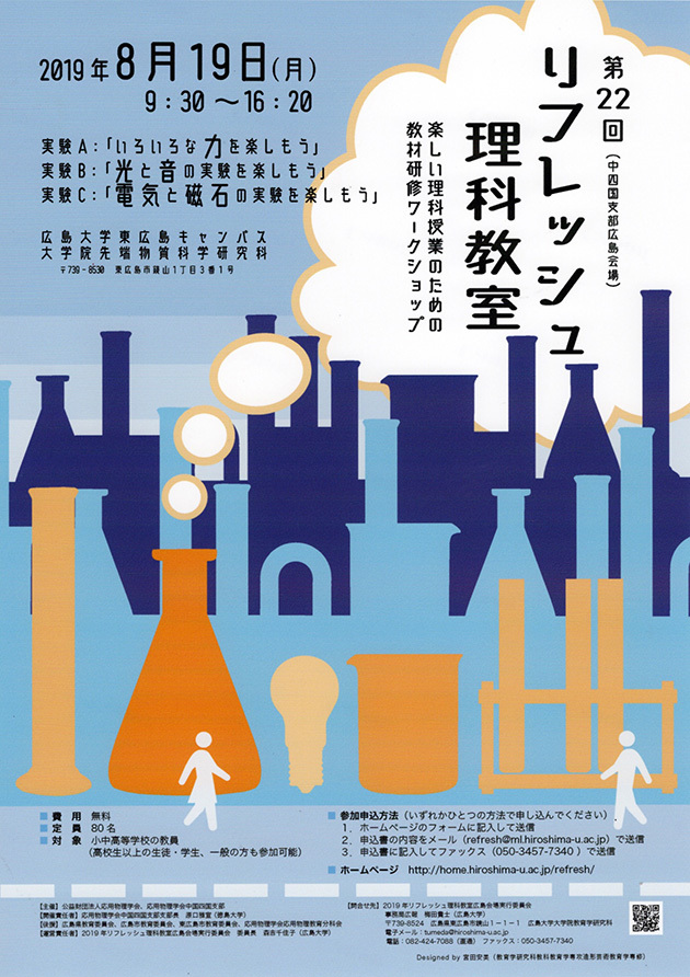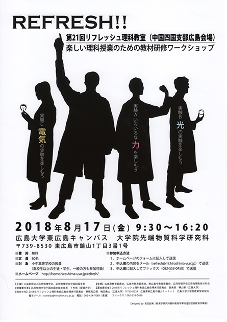 毎年開催されている「リフレッシュ理科教室」。今年(第22回)の中国四国支部広島会場(楽しい理科授業のための教材研修ワークショップ)のポスターを、彫刻ゼミM2の宮田安美さん(教育学研究科教科教育学専攻造形芸術教育学専修)が、昨年に引き続きデザインしました(左図)!前回のモノクロ(右図)とはまた違った、楽しいデザインです!