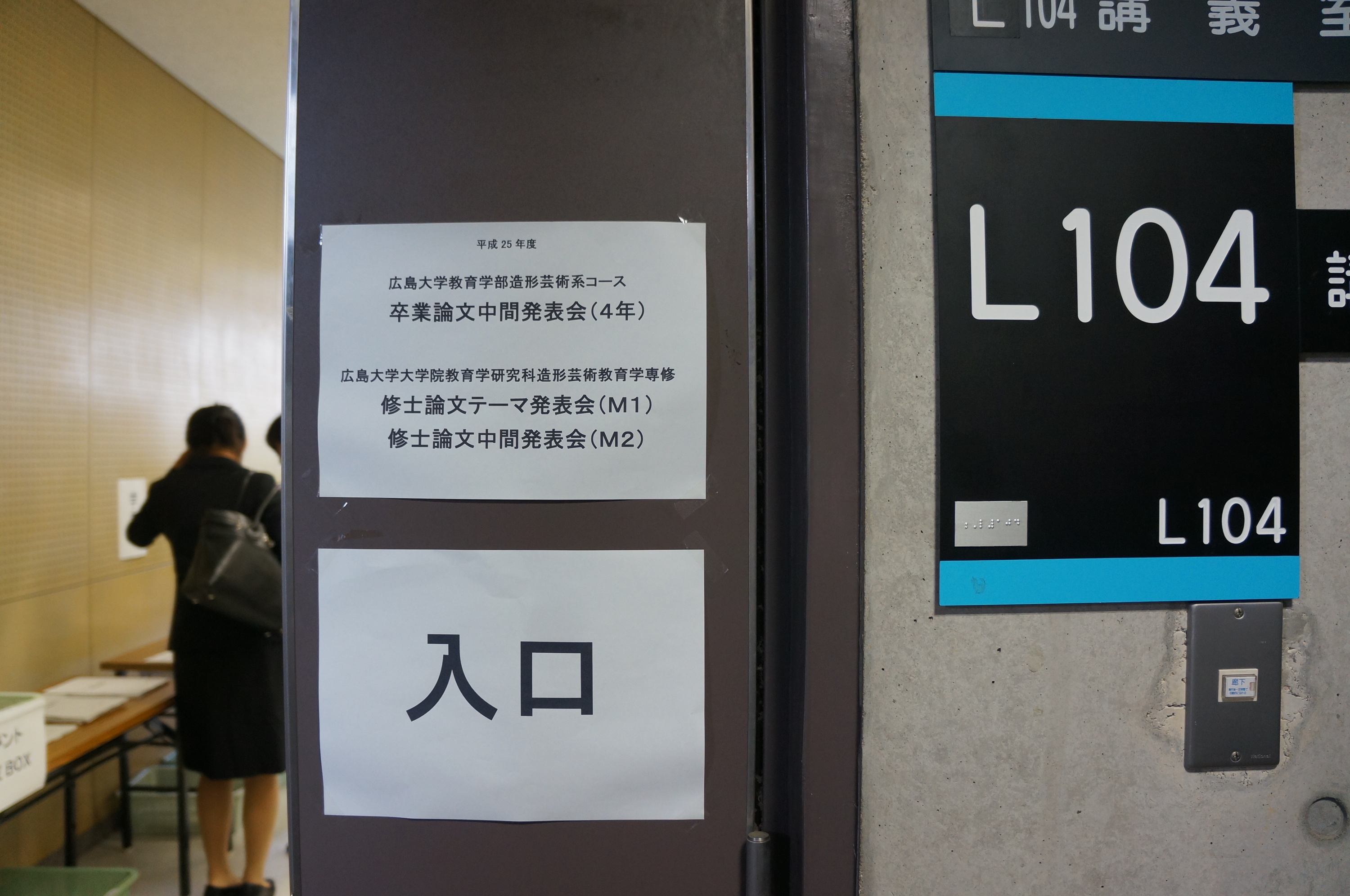 本日10月6日(日)午前9時半より、「平成25年度 広島大学教育学部造形芸術系コース卒業研究中間発表会(4年)及び広島大学大学院教育学研究科 造形芸術教育学選集修士論文テーマ発表会(M1)・修士論文中間発表会(M2)」が、広島大学教育学部L104号教室で開催されました。この会は、来年1月末の提出を目指している論文について、これまでの研究成果を発表する場です。それぞれの発表の後、質疑応答の時間があり、教員、学生により盛んな意見交換がされました。