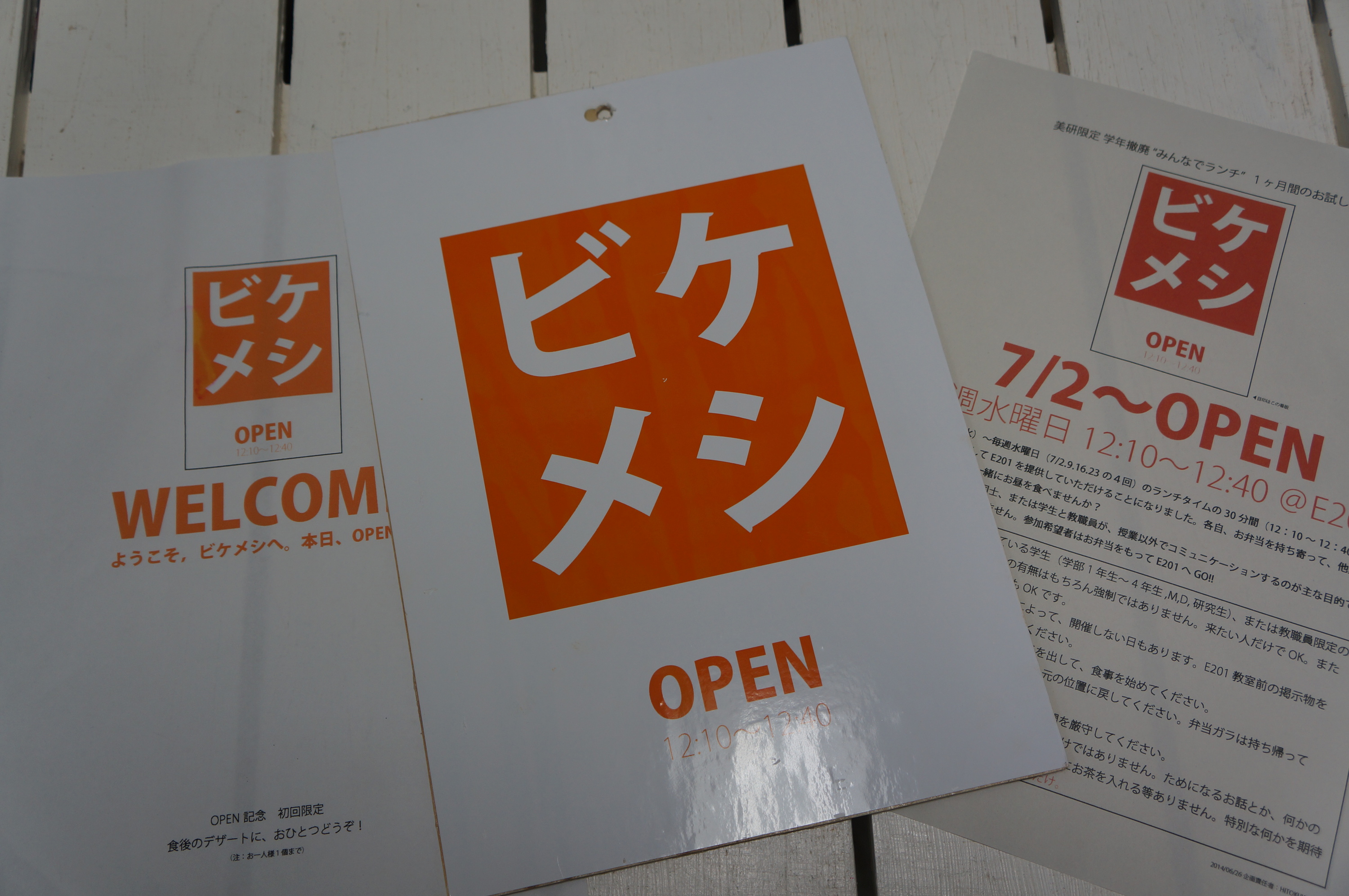美術研究室に所属する学生同士や教職員との交流を深めるため、週1回のお弁当持ちより企画「ビケメシ」が先週から始まりました。NHKの「サラメシ」をヒントにしたこの企画。「ビケメシ」の「ビケ」は美術研究室=ビケン からもじって。先週、今週と30人以上の学生、教職員が集まり、楽しく会食しました。学生室長の鎌田君(24生)は、毎回、この時間のためにラジオ番組を制作・放送し、大好評です。
