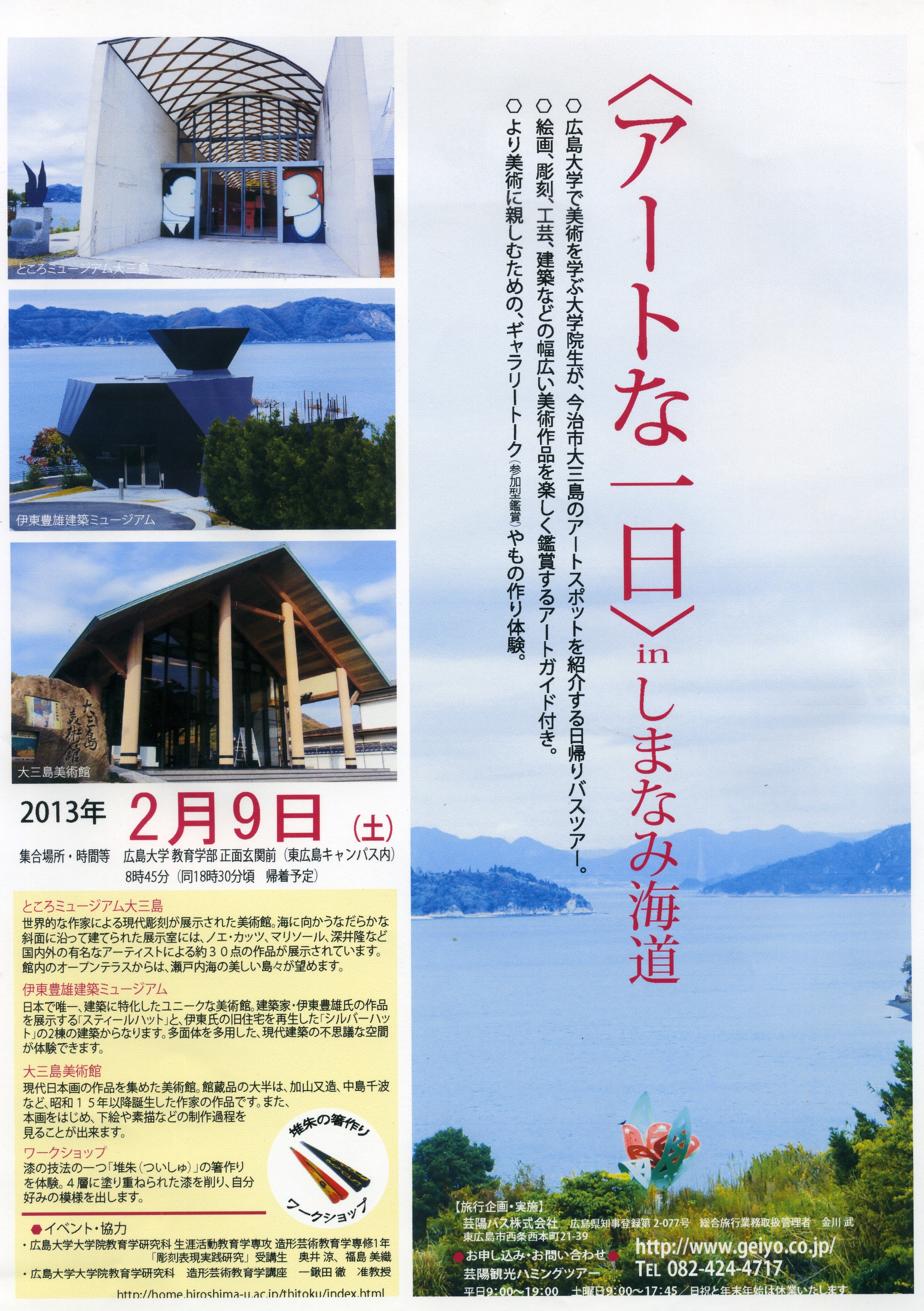 大学院授業「彫刻表現実践研究」では、ここ数年、アートをキーワードにしたバスツアーを企画しています。アイデアを出すところから、バス会社への企画持ち込み、下見、一般参加者の公募、実施に至るまで、できるだけのことを学生自身が行います。平成24年度の授業では、愛媛県今治市の大三島にある「ところミュージアム大三島」「伊東豊雄建築ミュージアム」「大三島美術館」を訪れたり、堆朱の箸作り等のワークショップを行いました。定員を超える多くのお申し込みをいただき、キャンセル待ちが出るほどの盛況でした。当日の様子は、「今治市伊東豊雄建築ミュージアム」HP(ブログ 2013年2月9日分)にも掲載されています。是非、ご覧ください。