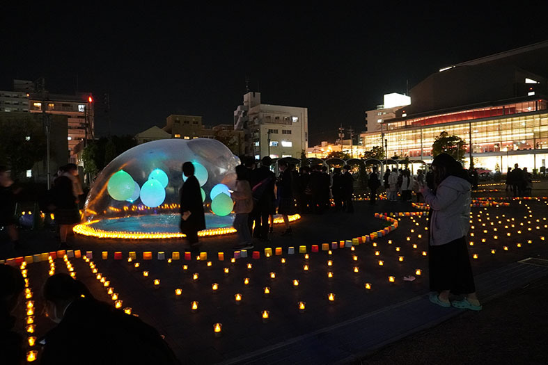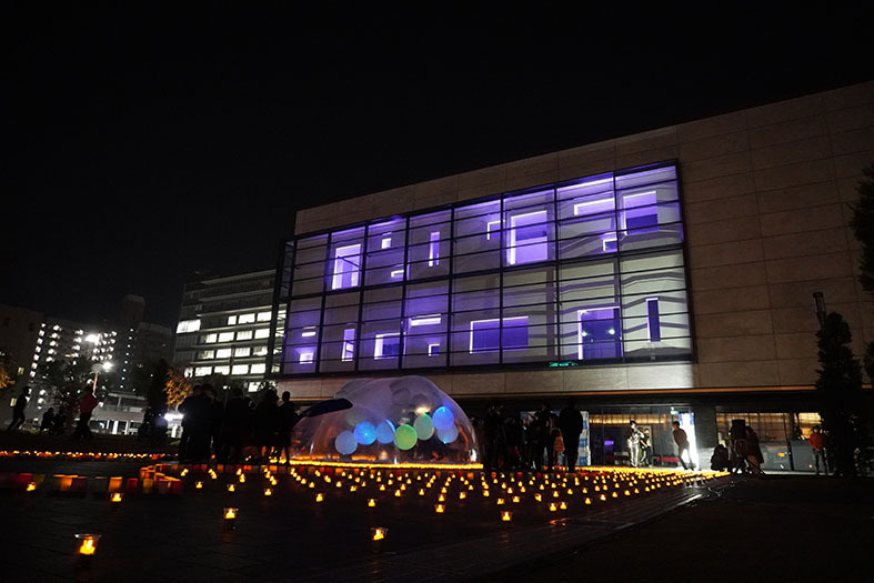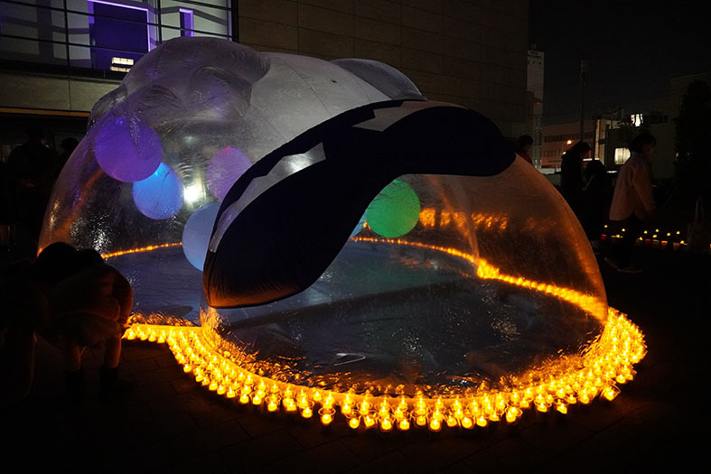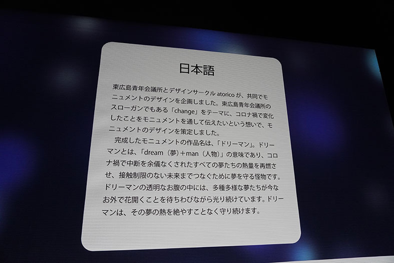 2021年11月19日(金)〜21日(日),一般社団法人 東広島青年会議所の主催による「光のアートガーデンin 東広島」が開催されました。会場である,東広島市立美術館前の西条中央公園には,彫刻ゼミ4年 山崎壱大君のデザインしたバルーン作品“ドリーマン”(dream+manの意)が展示されました。
