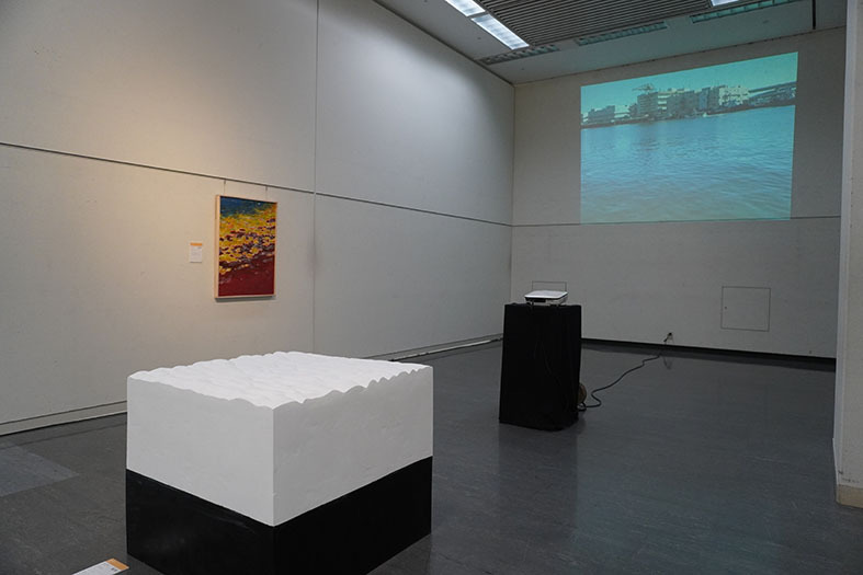 ①『ゆらぎ』(H750×W900×D900 石膏・鉄・映像)