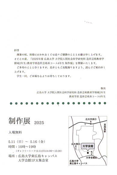 彫刻ゼミからは,丸川さん,アカインさん,の2名が出品しています。昨年10月から取り組んできた2人の力作を,ぜひ会場でご覧ください。