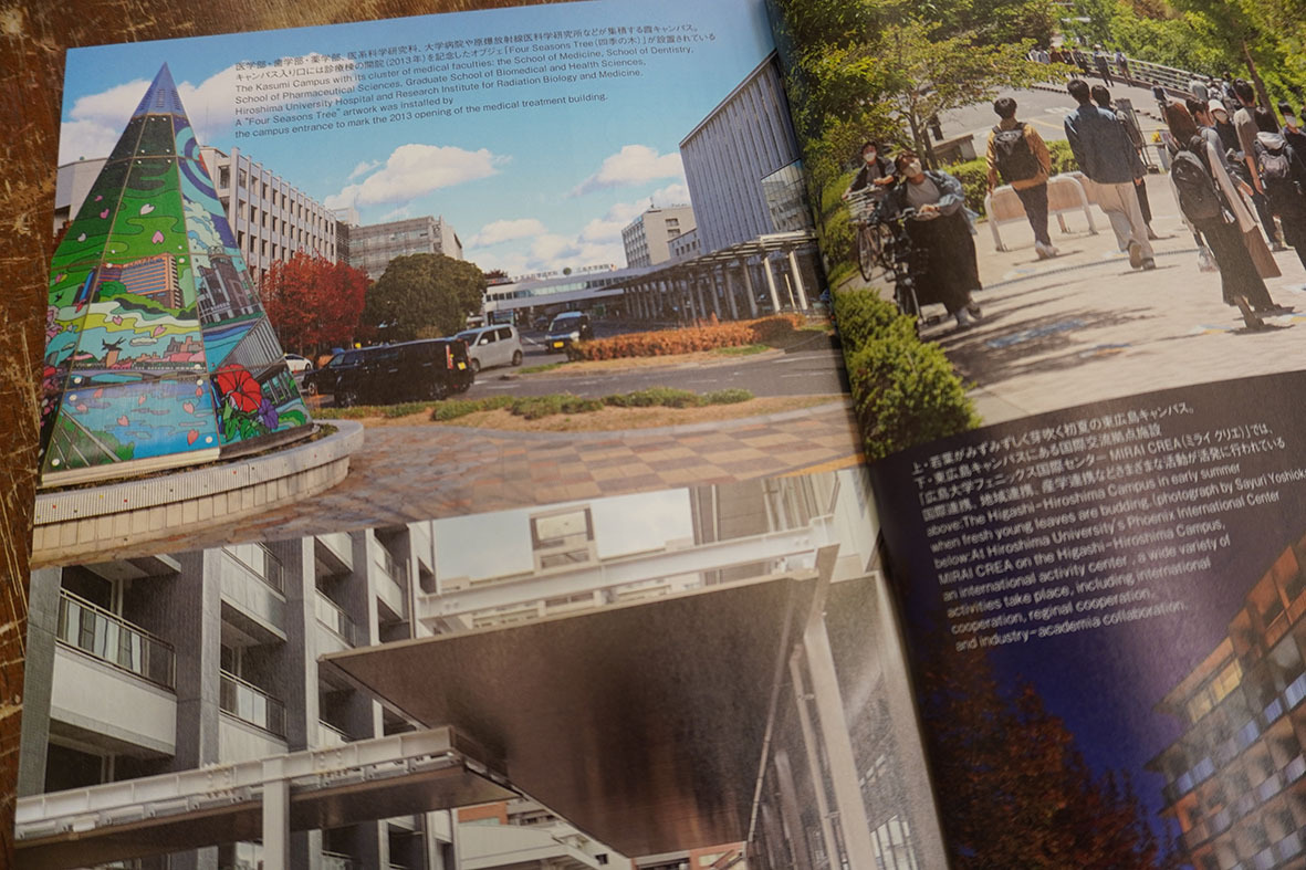 「医学部・歯学部・薬学部,医系科学研究科,大学病院や原爆放射線医科学研究所などが集積する霞キャンパス。キャンパス入り口には診療棟の開院(2013年)を記念したオブジェ「Four Seasons Tree(四季の木)」が設置されている」