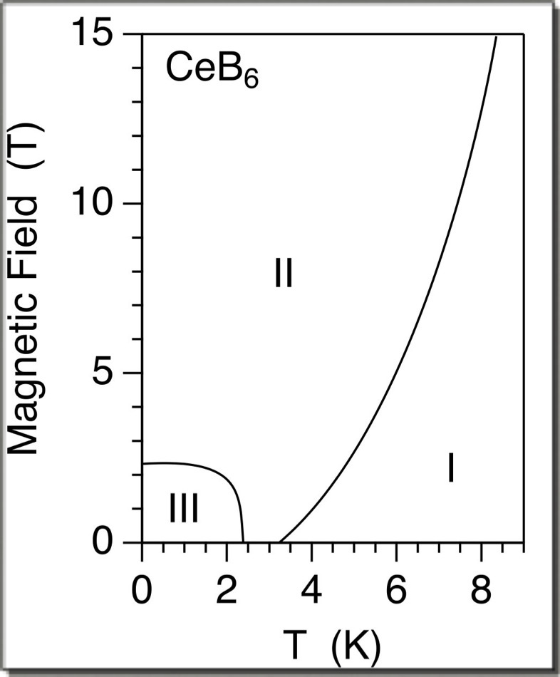 【1】CeB6の磁気相図.I相は常磁性相,II相は反強四極子秩序相(AFQ),III相は反強磁性秩序相(AFM). 【4】2.5 K (AFQ相),[-110]方向の磁場中での,(3/2, 3/2, 1/2)Bragg反射強度のエネルギー依存性(PRL論文のFig. 1).磁場方向を反転させるとE1共鳴(5.724 keV)とE2共鳴(5.718 keV)での強度が変化する.吸収補正なし,バックグラウンド差引きなしの生データ. |