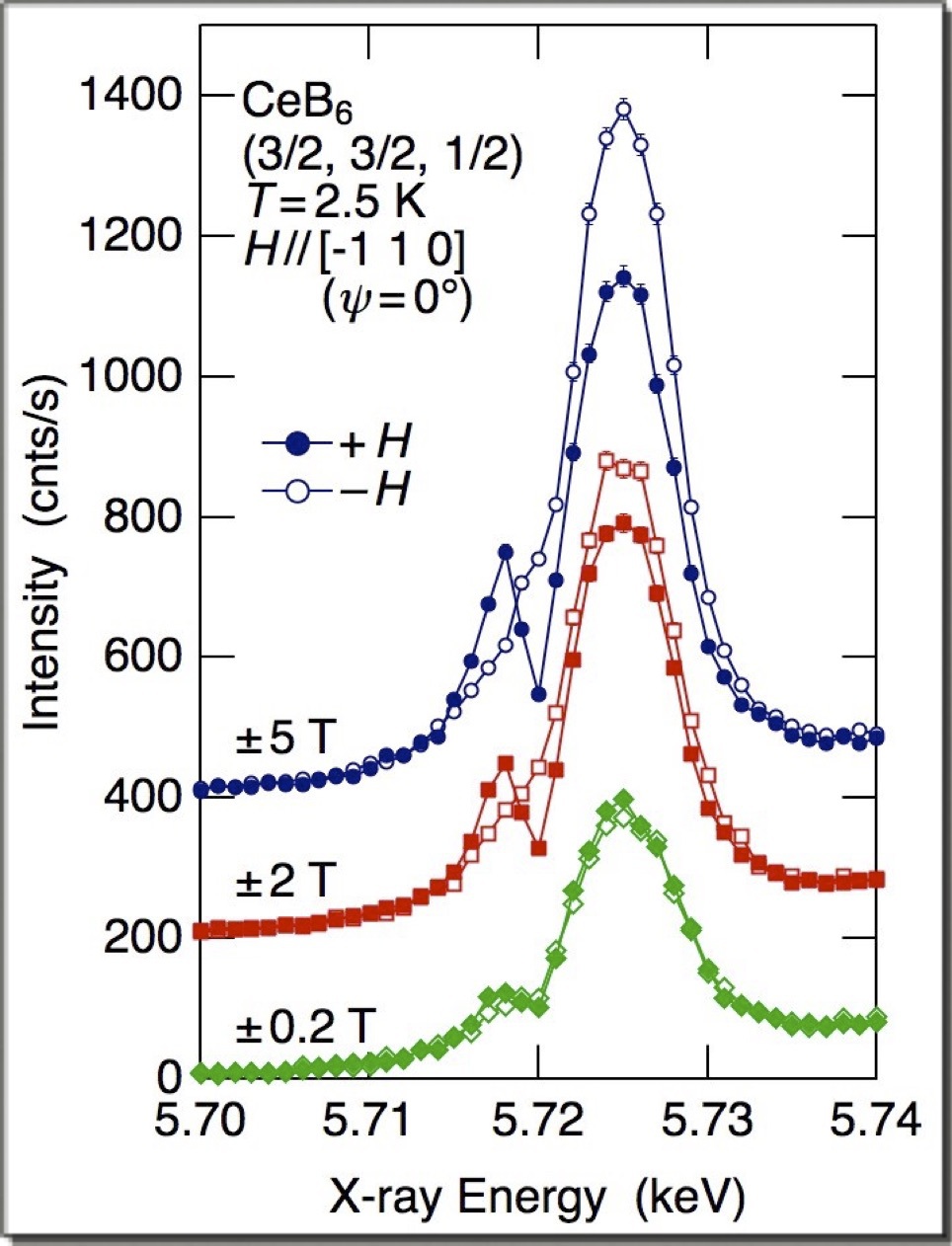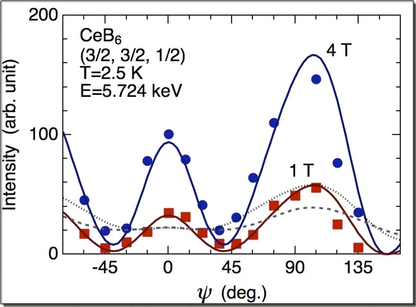| ◎ 研究背景 歴史的にPara相をI相,AFQ相をII相,反強磁性磁気秩序相 (AntiFerroMagnetic order, AFM) をIII相と呼んできた.2.3 Kの反強磁性転移が鋭い比熱のピークを示すのに対して,3.3 Kでの比熱の異常は弱く,1970年代当初は不純物と考えられたこともあったが,磁場をかけると3.3 Kの転移温度が上昇し,比熱異常も大きくなっていくことが見出され,何か本質的な異常相が現れているにちがいないと考えられるようになった[1].磁場をかけると非常に奇妙な反強磁性が誘起されてくることがNMRからわかり[2],f電子系における反強的軌道秩序の理論[3],中性子回折による磁場誘起反強磁性の観測を経て[4],反強的電気四極子秩序(AFQ)の考え方が浸透していったのである.しかし,最大の矛盾はNMRから導き出された磁場誘起反強磁性の磁気構造と中性子回折が示すそれとが違うことにあった.NMRは直接磁気構造を観測するわけではないが,提案された磁気構造モデルと実験データとの整合性はよい.一方,中性子回折は直接磁気構造を観測するものであり,q=(1/2,1/2,1/2)の秩序,H//[001]のとき反強磁性は誘起されない,H//[110]のとき[001]方向の反強磁性が誘起される,といった実験結果は明瞭である.NMRの結果をどう考えたらよいかというのが,残された問題であった. ◎ 我々の実験目的 AFQの観測そのものはなされたので,次のステップに進まねばならない.CeB6のAFQ秩序変数はΓ5g (Oxy)型(ゼロ磁場ではOyzとOzxとOxyの3ドメイン)であり,磁場中では3成分の線形結合で表され,磁場方向を方向余弦(α,β,γ)で表すとき, ◎ 磁場反転効果 磁場方向を変えたときにAFQ秩序変数が連続的に変化する様子を観測するため,KEK-PFのBL-3Aに設置された2軸回折計と8T縦磁場超伝導マグネットを用い,私と学生のTYとKKは,+4 Tの磁場中で試料(azimuthal angle, ψ)を回しながら(3/2, 3/2, 1/2)反射の共鳴スペクトルを測定していた(PRB論文のFig. 1の配置).すると,H//[-110]のψ=0°でははっきり見えていた共鳴信号が,ψ=180°の H//[1-10] 付近になると非常に見えにくくなり,困ってしまった.試料は機械的に歯車で回しているので,回転させることでビーム中心からずれる可能性は否定できない.それによる強度変化は(3,3,1)基本反射の強度でモニターし,後で規格化するのがいつもの手段である.ところが,同じになるはずのψ=0°とψ=180°とが同じになりそうにないし,何か変だし,どうしたものかと困ったのである.それならば,試料を回さずに磁場方向を逆転させてチェックしてみようと思い,ψ=0°でマイナス磁場をかけてエネルギー依存性を測定してみた.すると,上図【4】の生データに示すとおり,磁場反転で異なるスペクトルが得られたのである.磁場反転しても試料が動いていないことは基本反射の強度で確認できているし, 理由はわからないけれど,これは何か本物をつかんだかもしれないと思った.ビームタイム中はとにかくデータだけとって,大学に帰ってから散乱振幅の式を基本からこねくり回し,磁場反転で一体自分たちは何を測定したのかを考えた.1ヶ月くらいかかってたどりついた結論が,E1とE2の干渉効果による磁場誘起磁気八極子の観測である.基本的な考え方はPRL論文に書いたが,きちんと整理した形で記したのはPRB論文である. ◎ 干渉効果 磁場反転で強度が変わるのは異なる機構の散乱が重なることによる干渉効果である.要点だけ記すと,たとえばAとBの2種類の散乱機構があり,それぞれの構造因子をFA, FBとすると,観測強度は|FA+FB|^2=|FA|^2+|FB|^2+(FA*FB+FAFB*)に比例し, (FA*FB+FAFB*)の部分が干渉項である. 強磁性の観測のように,Aが格子からの散乱でBが磁気散乱であるケースが典型例だが,今の場合はAがE1の磁気双極子(rank 1)でBがE1の電気四極子(rank 2),AがE1の電気四極子(rank 2)でBがE2の磁気八極子(rank 3)のような,共鳴散乱項どうしでの干渉が主である.E1共鳴とE2共鳴は独立ではなく,エネルギーが近ければスペクトルが重なって干渉する.ちなみに,E1とE2のあいだの干渉効果に私が最初に出会ったのはDyB2C2である[10].エネルギースペクトルをみると,E1とE2のあいだで鋭い極小がみられる.上図【4】の+Hでのスペクトルもそうである.E1とE2とが干渉せず,ただの足し合わせの強度|FA|^2+|FB|^2になるなら,このようなスペクトルにはならないだろう.DyB2C2での経験があったので,ここでも何かが干渉しているという直感が働いた. ◎ 多極子秩序変数の磁場依存性 上図【5】のように,強度の平均と差分をとり,構造モデルをたてて解析すると,いくつか仮定は持ち込まなければならないにせよ,それなりにもっともらしく各種秩序変数を分離して抽出することができる.H//[-110]での構造モデルは,Oyz-OzxのAFQ,Txyz-AFO,そしてJz-AFMが同時に発生しているというものである.ただし,AFQ相なので,磁気的にはparaであり,磁場を反転させるとTxyzとJzは符号を変えるがOyz-Ozxは符号を変えない.このモデルのもとで3つの秩序変数を抽出して,その磁場依存性をプロットしたのが下図【7】(PRB論文のFig. 10)である.Jzの磁場依存性は中性子とNMRの結果がすでに存在していたが,この図は電気四極子Oyz-Ozxと磁気八極子Txyzとい