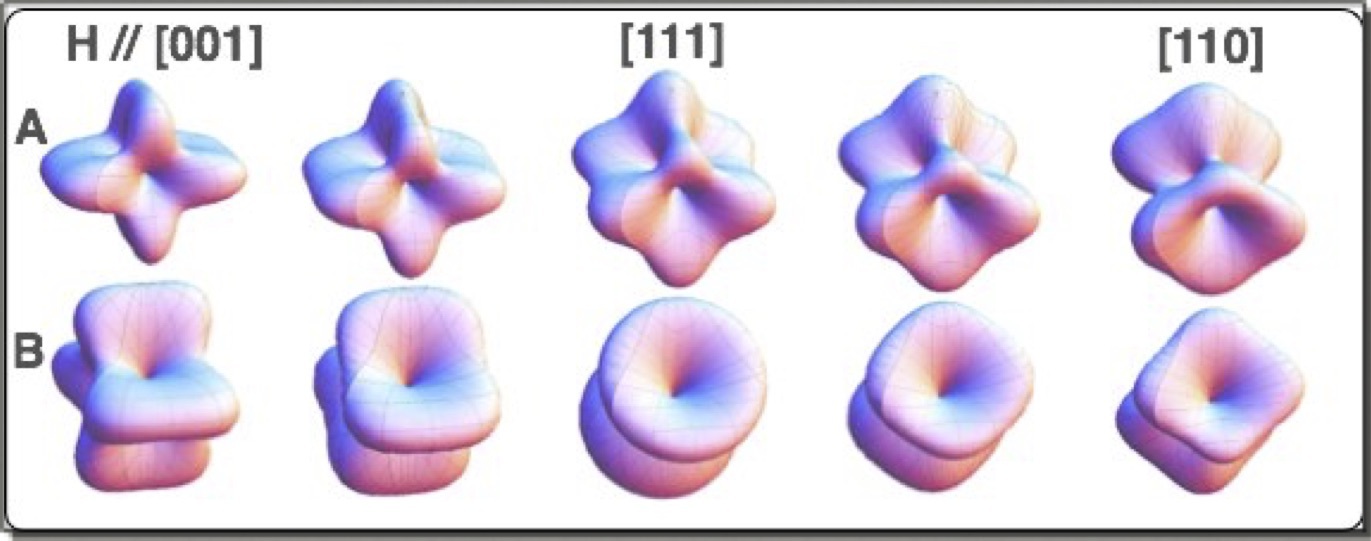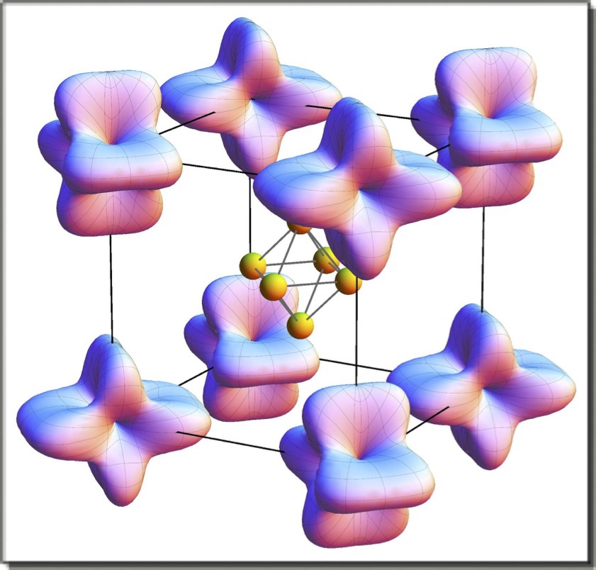 【6】CeB6のAFQ相で[001]方向に磁場をかけたときに誘起されるTxyz型磁気八極子.電荷密度が濃いところは上向きのNS.磁場方向が変わると,CeB6ではAFQ秩序変数が連続変化するので,どの磁場方向でもTxyz八極子が誘起される. |