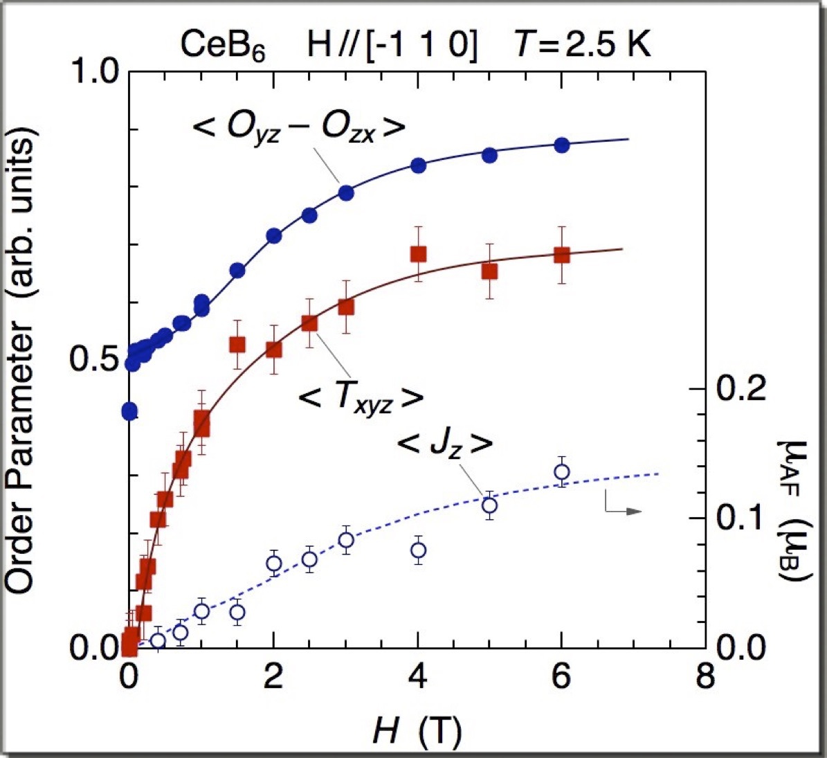 【7】CeB6のAFQ相,H//[-110]における秩序変数(電気四極子Oyz-Ozx,磁気双極子Jz,磁気八極子Txyz)の磁場依存性(PRB論文のFig. 10).双極子の絶対値はNMRによるもの.