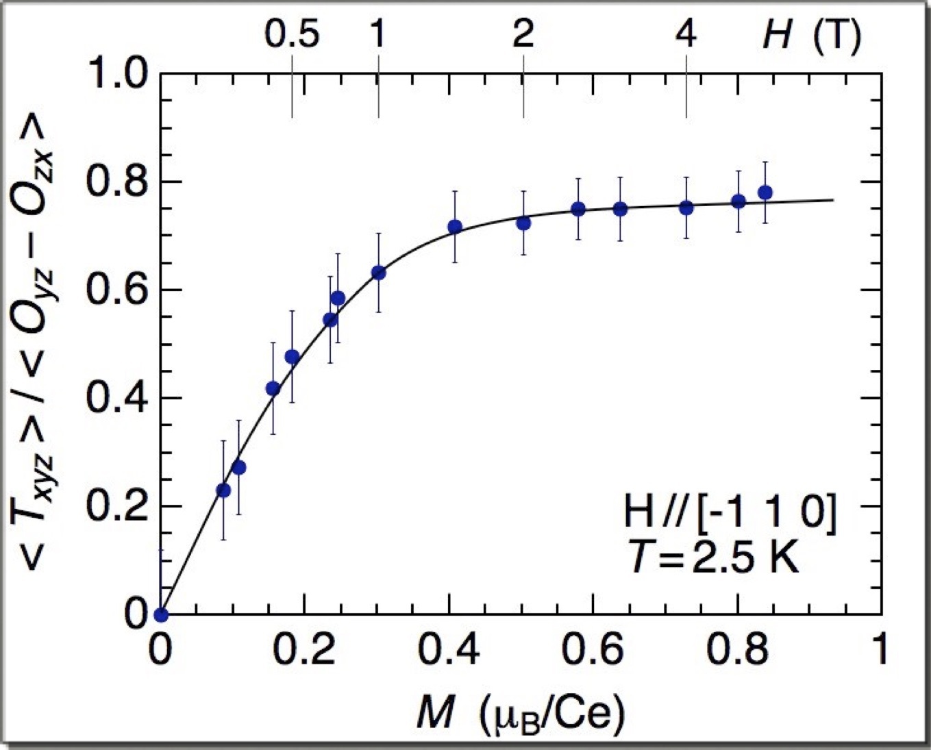 【8】<Txyz>と<Oyz-Ozx>の比を一様磁化Mに対してプロットしたもの(PRB論文のFig. 15).Ceイオン間でTxyzの相互作用があると,このように上に凸の曲線になるが,なければMに比例した直線になるはず. |