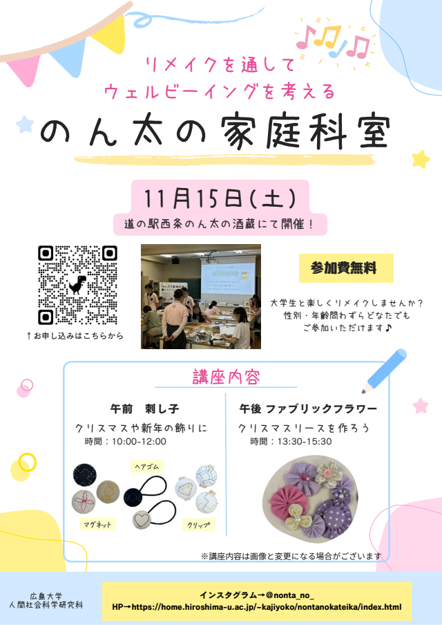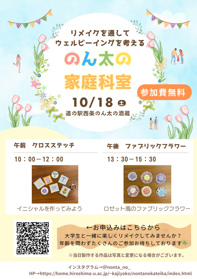 広島大学の学生と一緒に、子どもを守るおまじないの刺しゅう「背守り」や、豊栄ウール工房の羊毛を使った「フェルト作品」を製作するのん太の家庭科室を道の駅西条のん太の酒蔵の指定管理者事業として、開催します。
