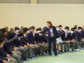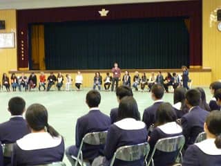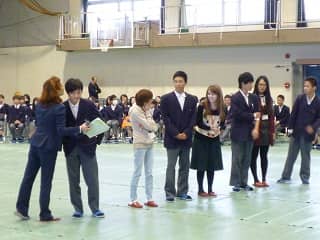 まずは、HUSA留学生による自己紹介のスピーチです。 恒松の”Elementary II” (レベル2)を受講している留学生3人(アメリカ・オーストラリア・ドイツ)による日本語のスピーチが披露されました。 質疑応答も英語と日本語で行われ、高校生にはびっくり体験となりました。