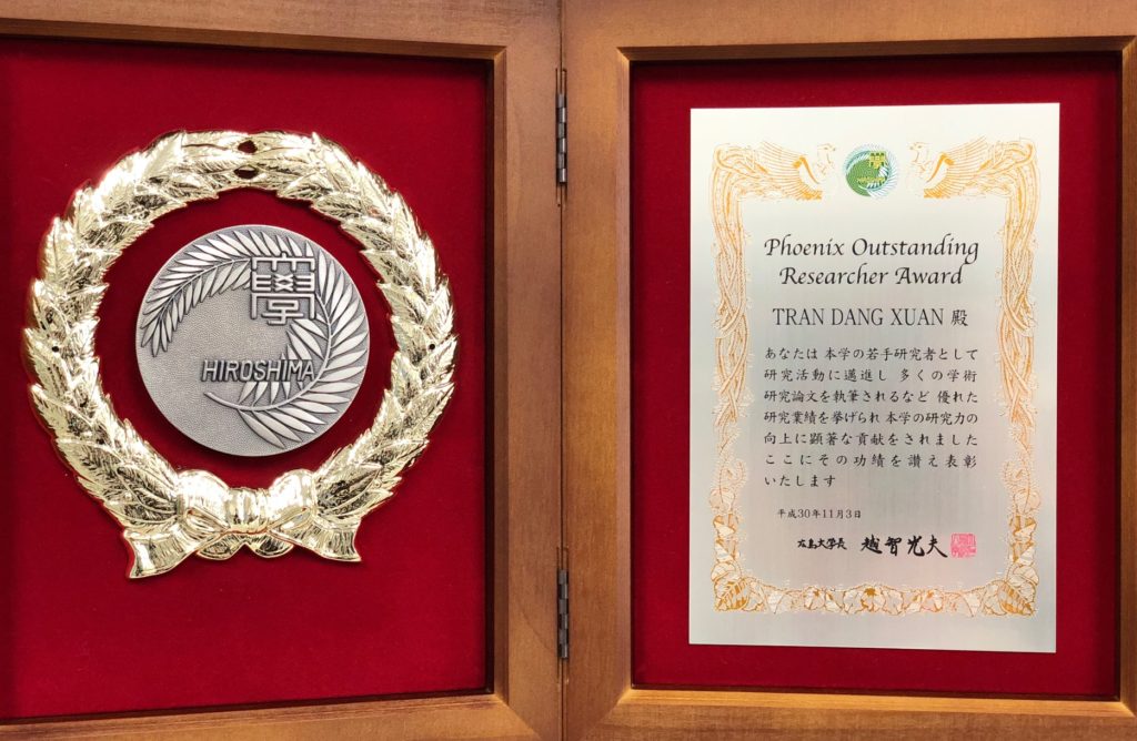 Our Laboratory honorably informs that Prof. Tran Dang Xuan, Head of our Laboratory, has also received the Phoenix Outstanding Researcher Award in 2018. In the two years 2017-2018, IDEC has only Prof. Tran Dang Xuan awarded this Phoenix Outstanding Researcher Award by Hiroshima University. This pride has been for Outstanding Researchers with age below 45 years. In 2018, there are six Professors received this pride (Engineering: 2, Medicine: 1, Biosphere Science: 1, Science: 1, and IDEC: 1). In 2017, there were 7 Professors got this excellent award (Universal Center: 1, Medicine: 1, Science: 2, Engineering: 1, IDEC: 1, and Advance Science: 1). Prof. Tran Dang Xuan was highly evaluated from his researches, published papers in international journals (most in Web of Science) with high citation score, and guidance of many foreign and Ph.D students in IDEC.